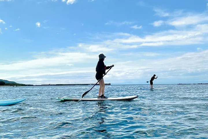 人気のマリンスポーツサップ。少人数制でインストラクターが丁寧に教えるので、はじめての方でも安心。記念写真データも差し上げます。