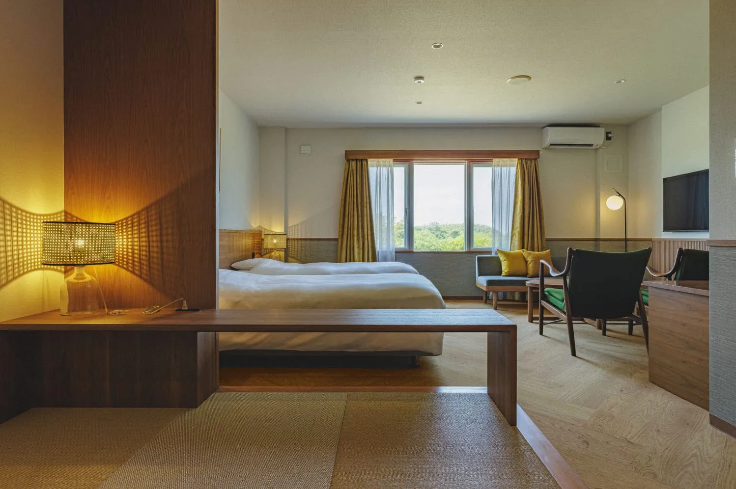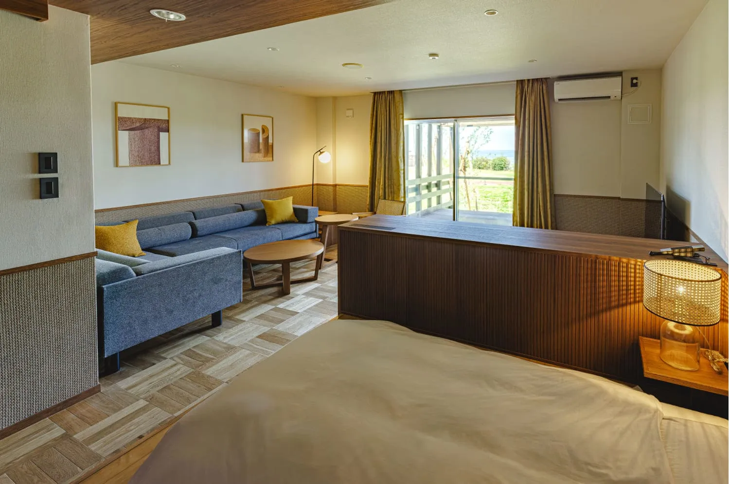 シーサイドテラスルーム・プレミアプライベートテラス付で、ウッド調の質感が心地いいお部屋です。柔らかな光が差し込む欄間扉をあけると、ゆとりのあるスペースが広がります。寝具はレイアウトフリー。