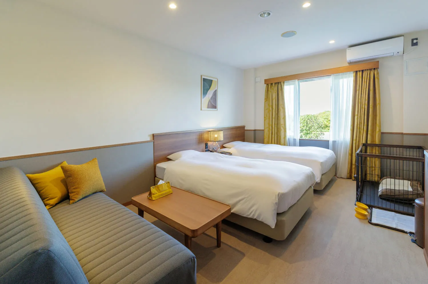 ドッグフレンドリールーム愛犬と一緒にお過ごしいただける1部屋限定のお部屋です。シンプルかつ機能的な空間で、客室隣の非常口より外への出入りが可能です。お散歩にもでかけやすく、ペット専用の備品もご用意しております。
