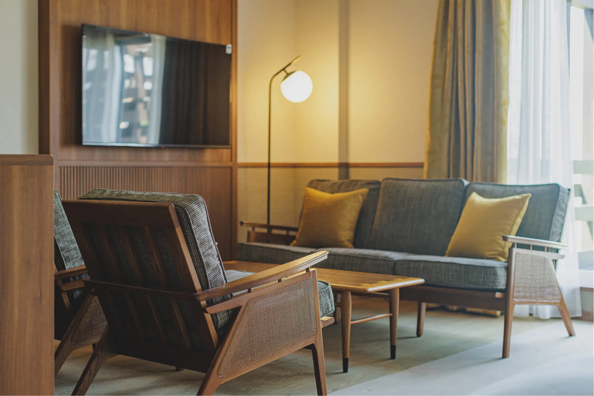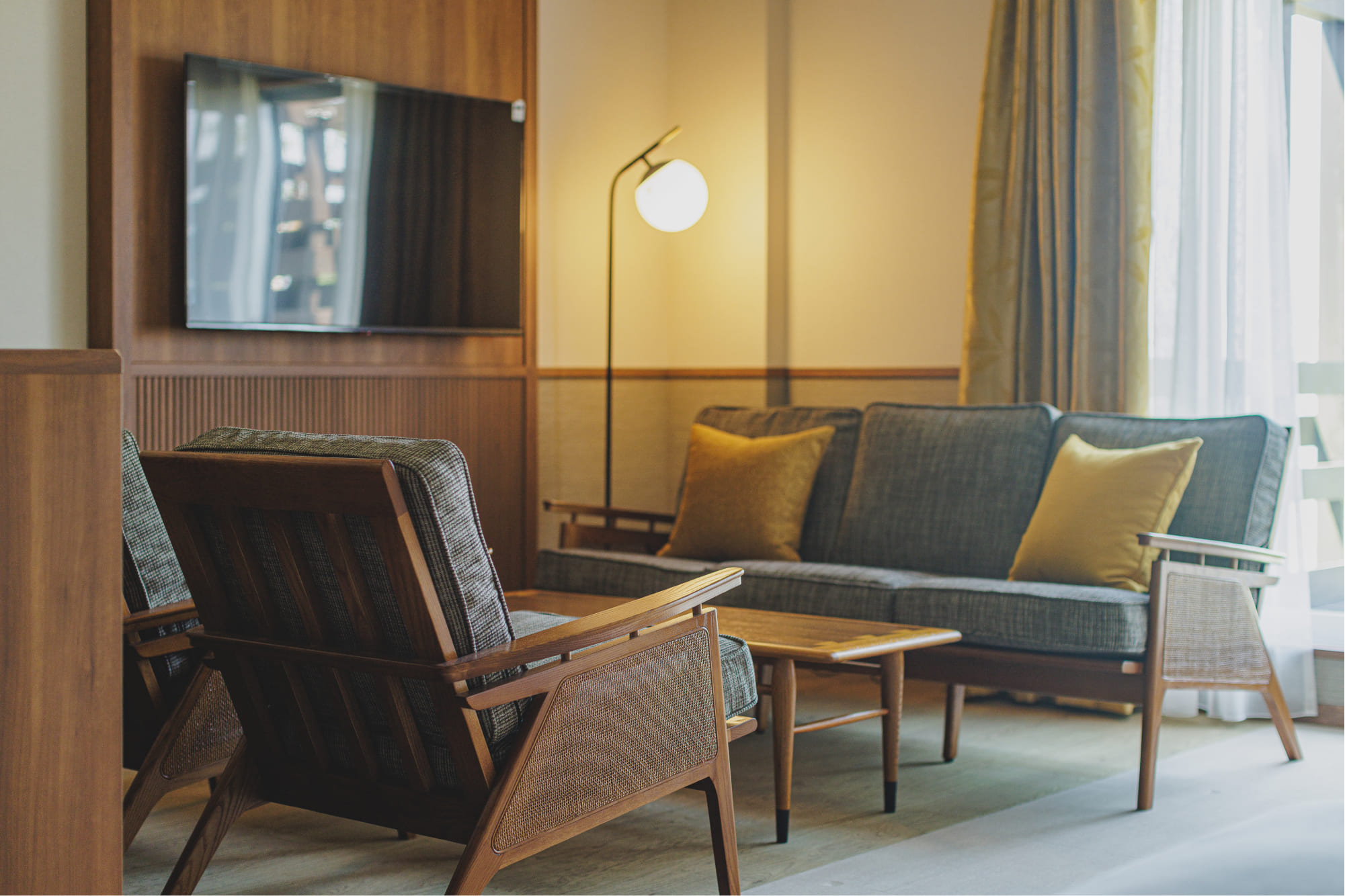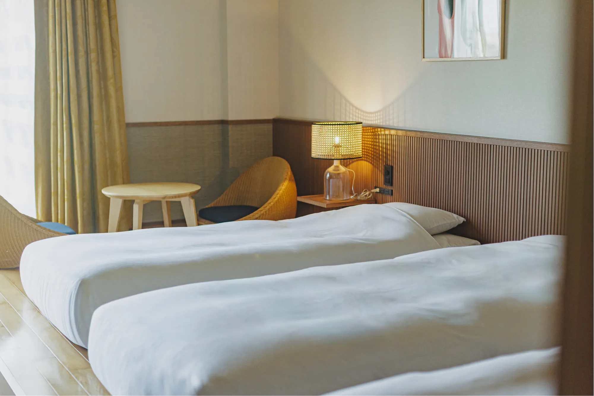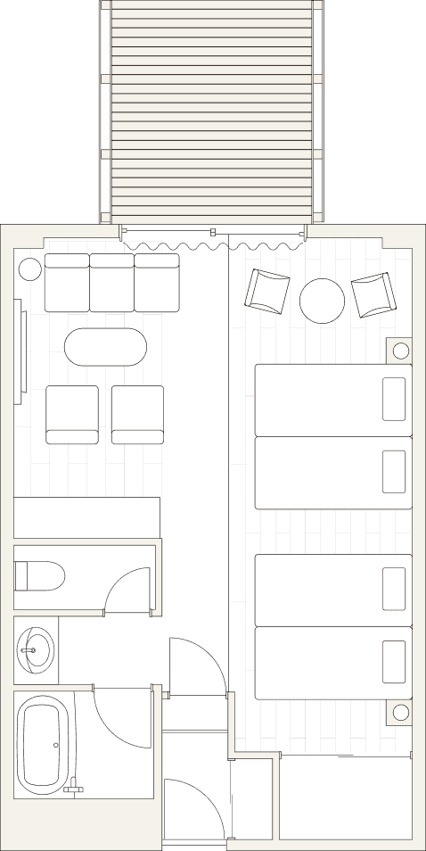 プライベートテラス付で、ウッド調で落ち着きのあるお部屋です。シーサイドテラスルームと比べてフローリングが広く、寝具はレイアウトフリー。