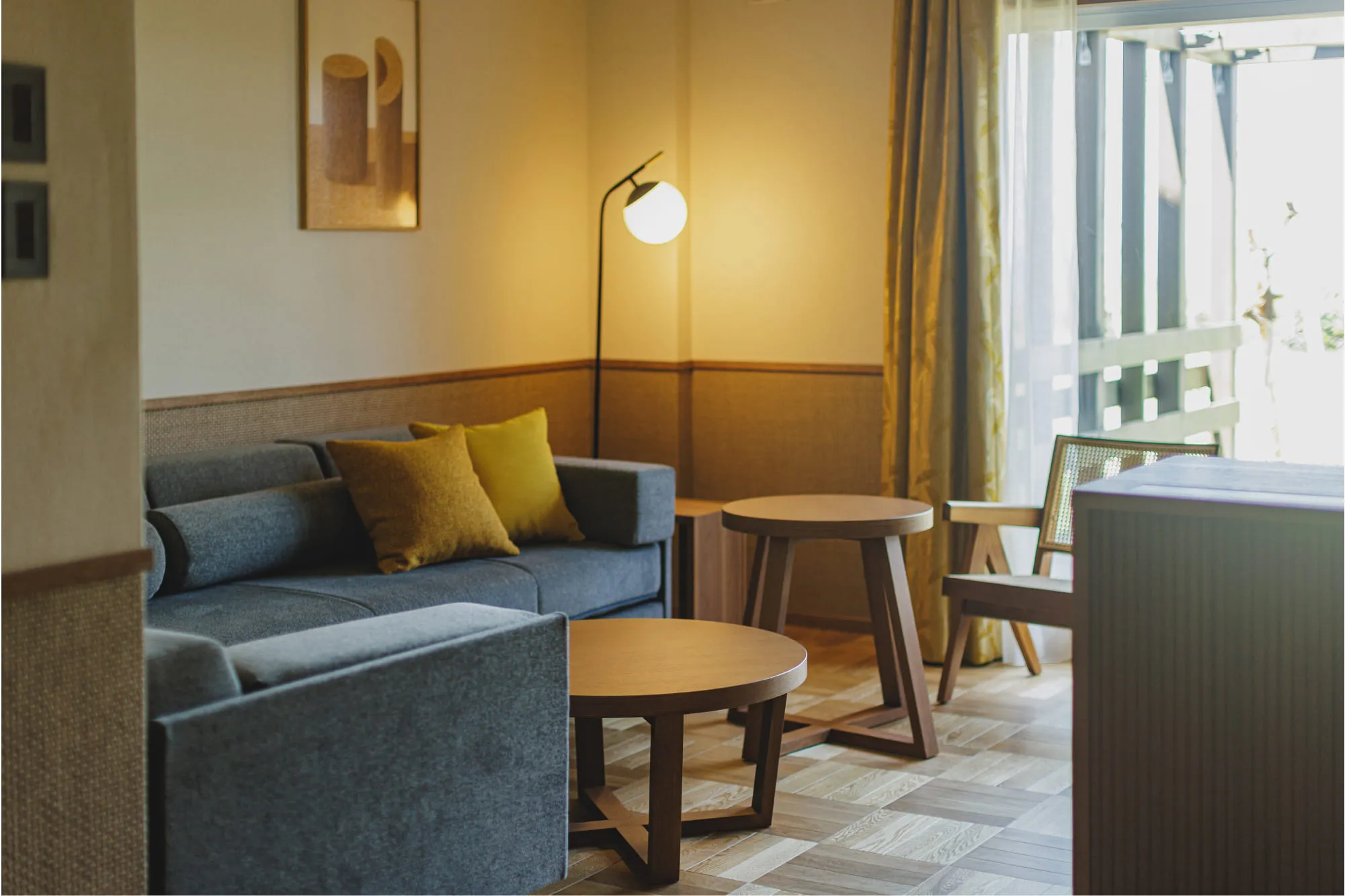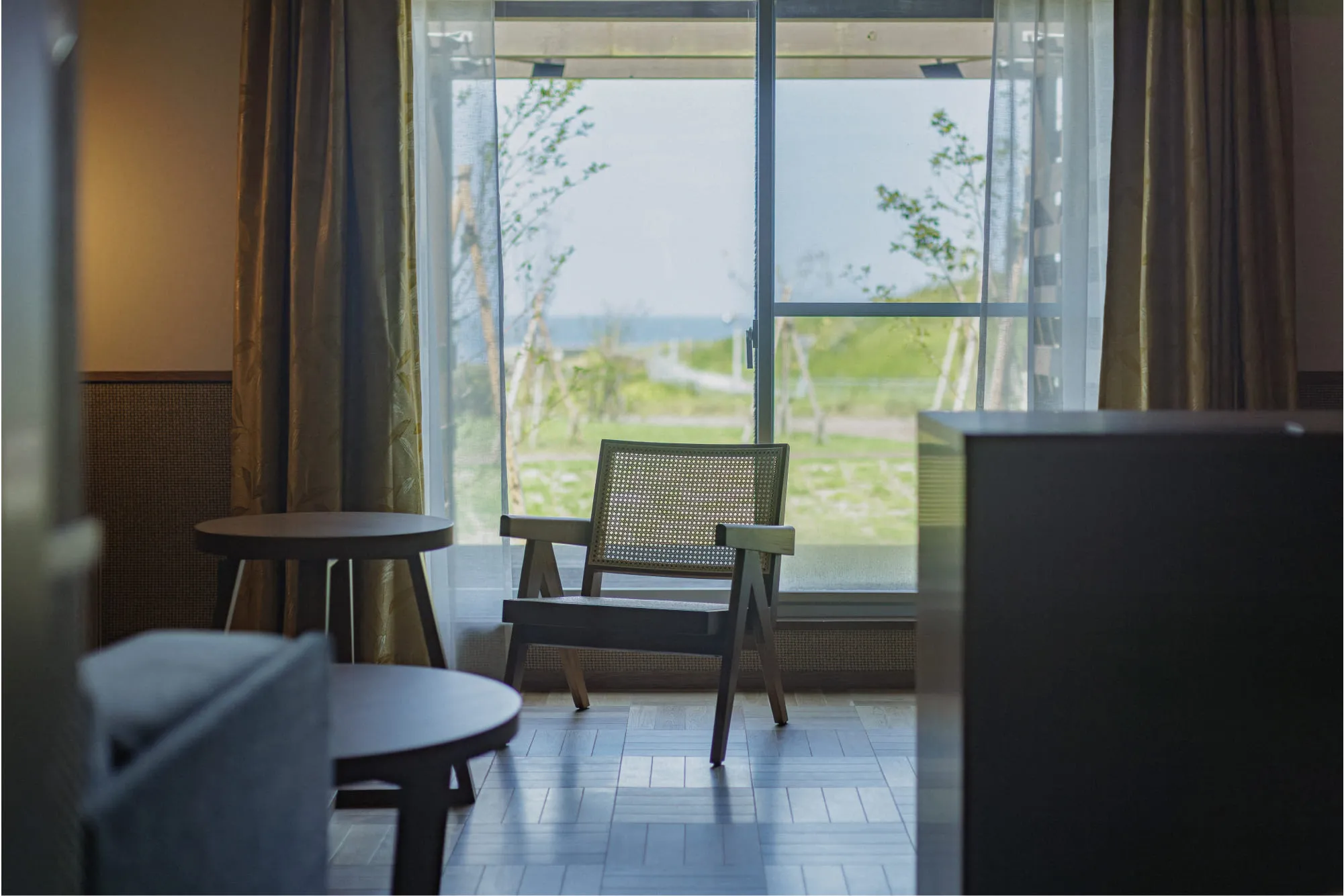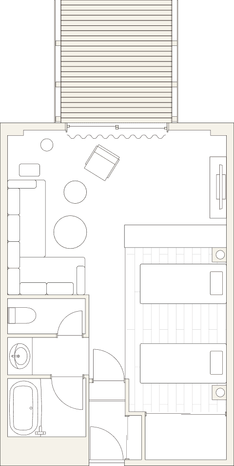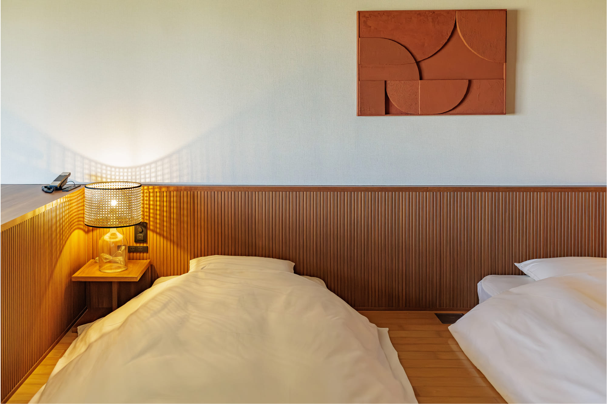 プライベートテラス付で、ウッド調の質感が心地いいお部屋です。柔らかな光が差し込む欄間扉をあけると、ゆとりのあるスペースが広がります。寝具はレイアウトフリー。