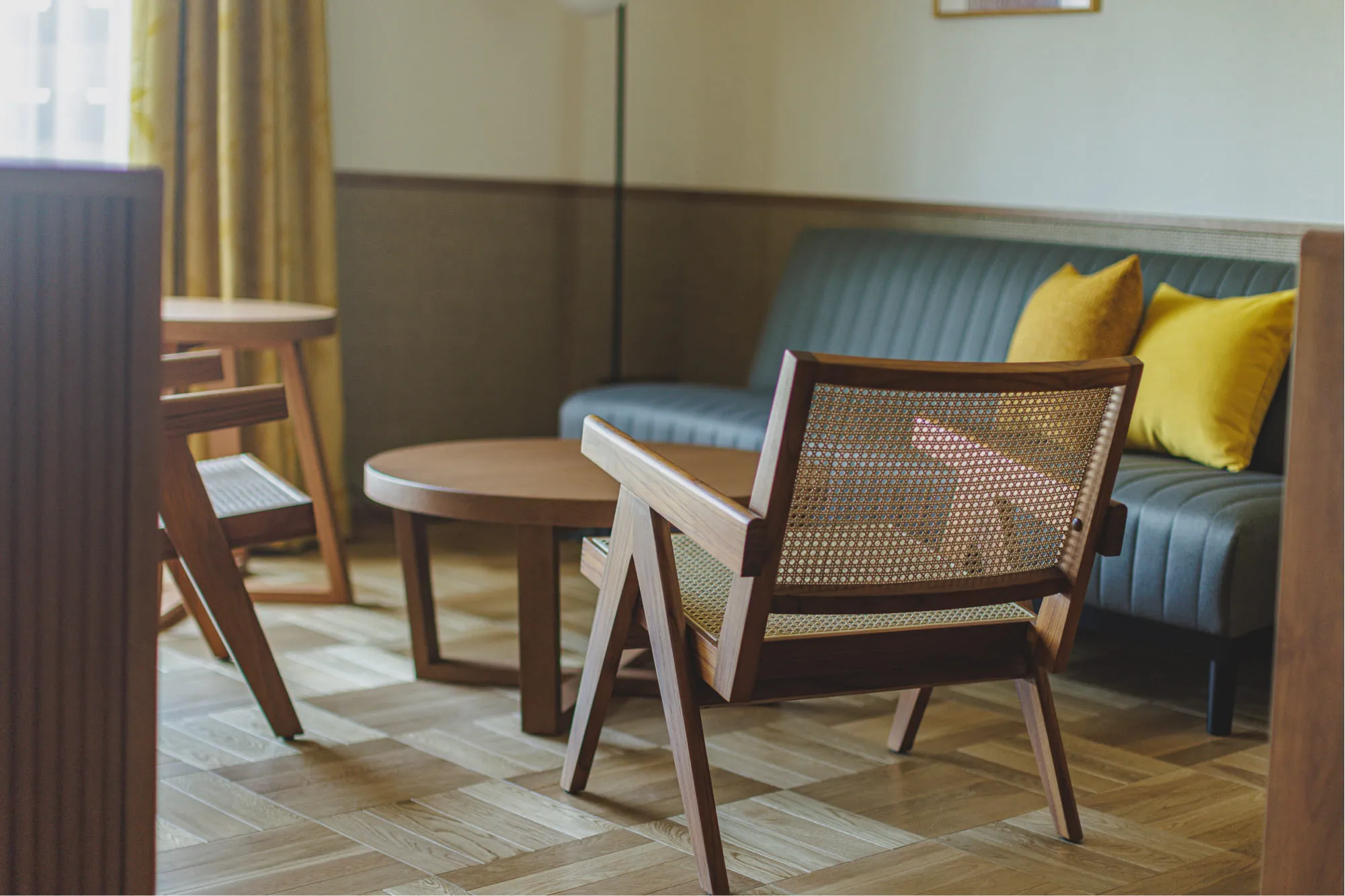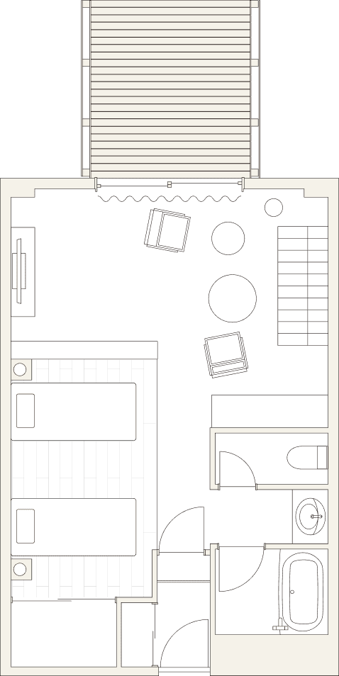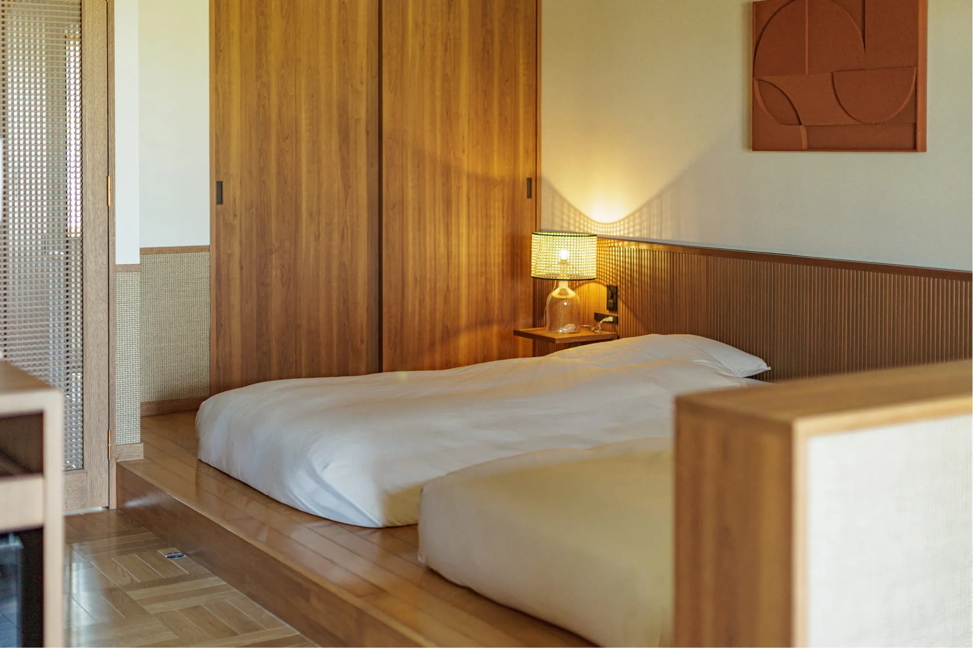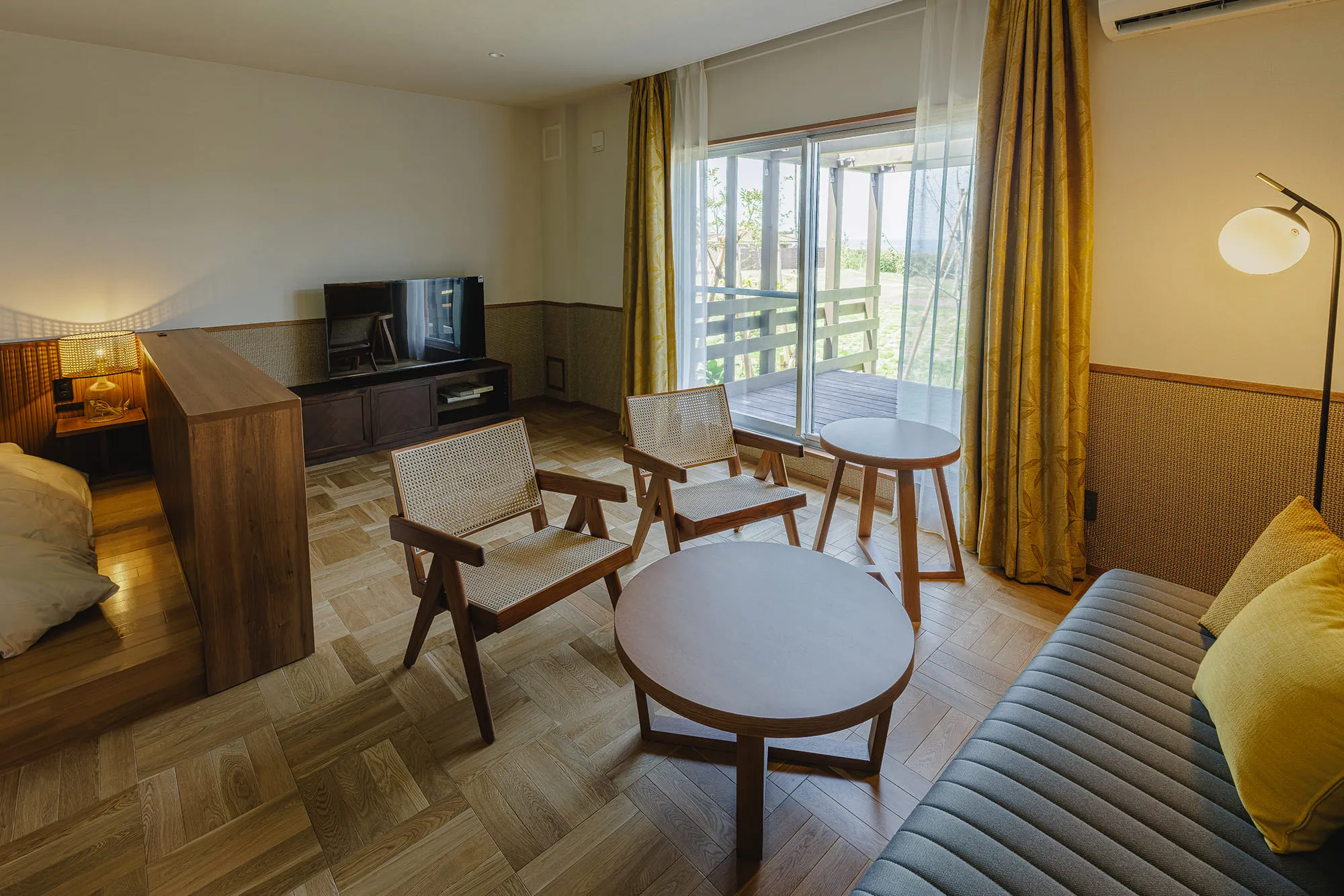 プライベートテラス付で、ウッド調で落ち着きのあるお部屋です。シーサイドテラスルーム・4ベッドと比べてリビングが広く、寝具はレイアウトフリー。