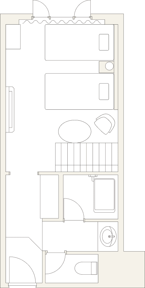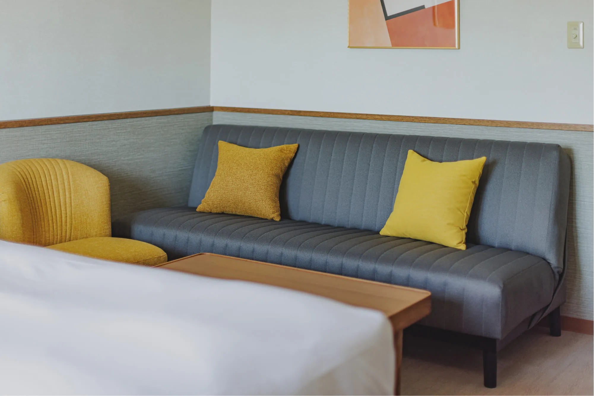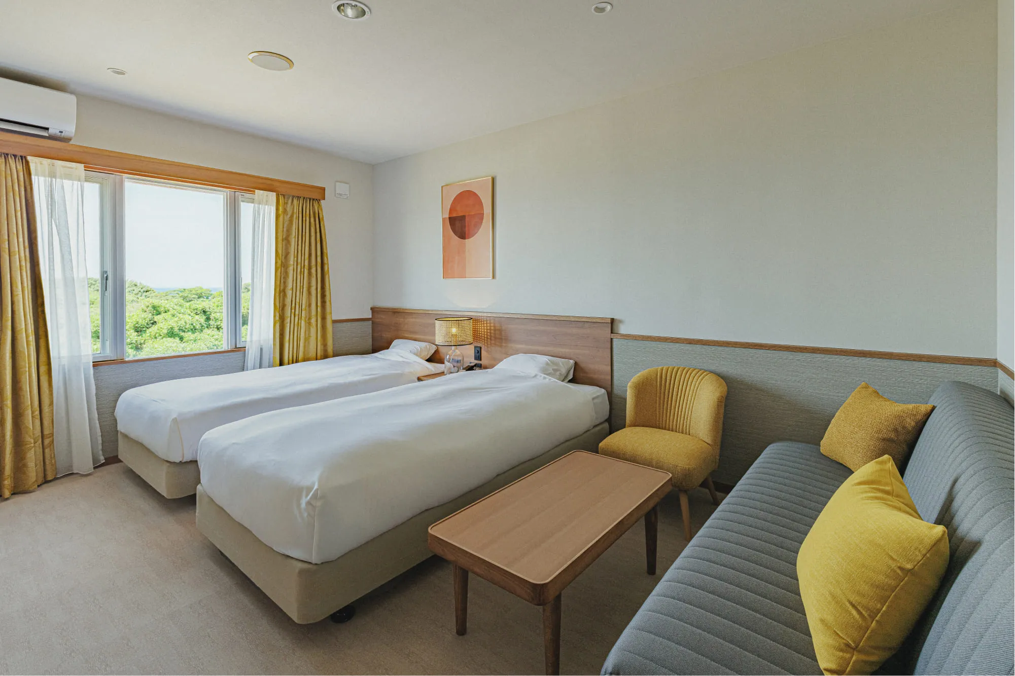 夕日をイメージした色彩が特徴的な、30㎡と広めのお部屋です。ソファベッドを使って最大3名様でご宿泊いただけます。バス・トイレ・洗面台別で、ゆったりご滞在いただけます。